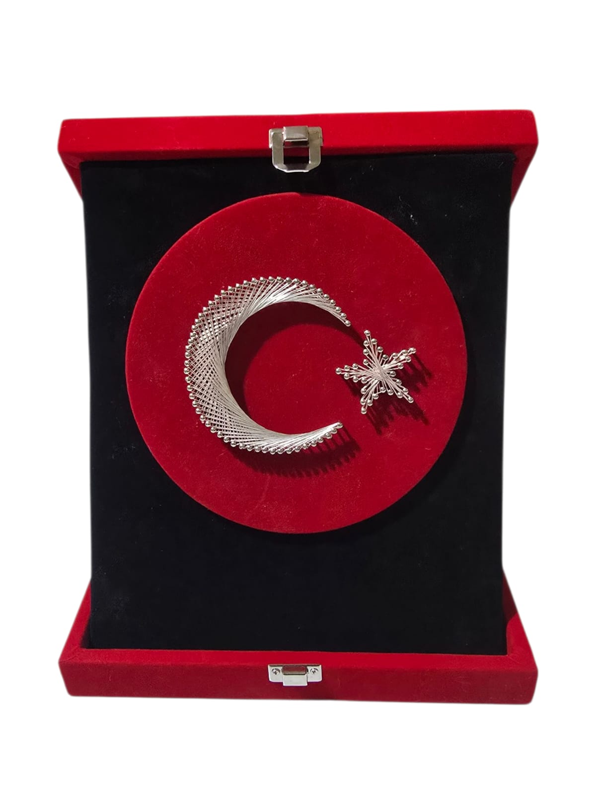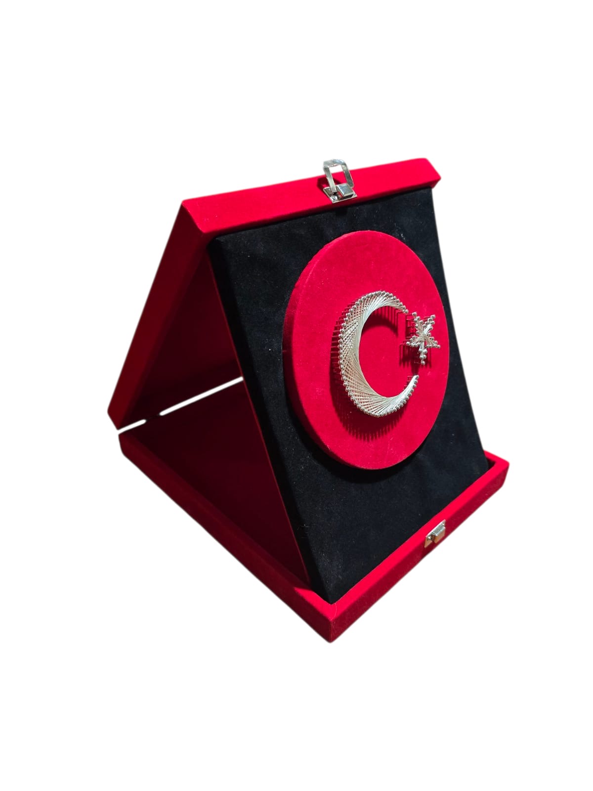 Filografi Türk Bayrağı Yuvarlak Plaket Model Kadife Kutulu