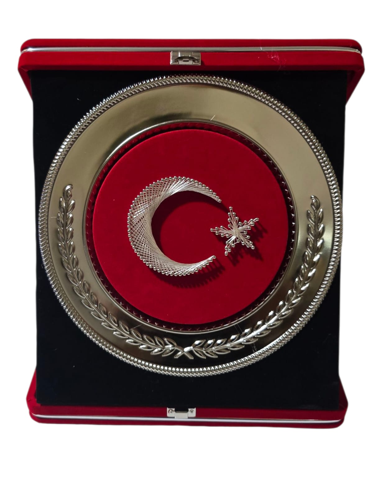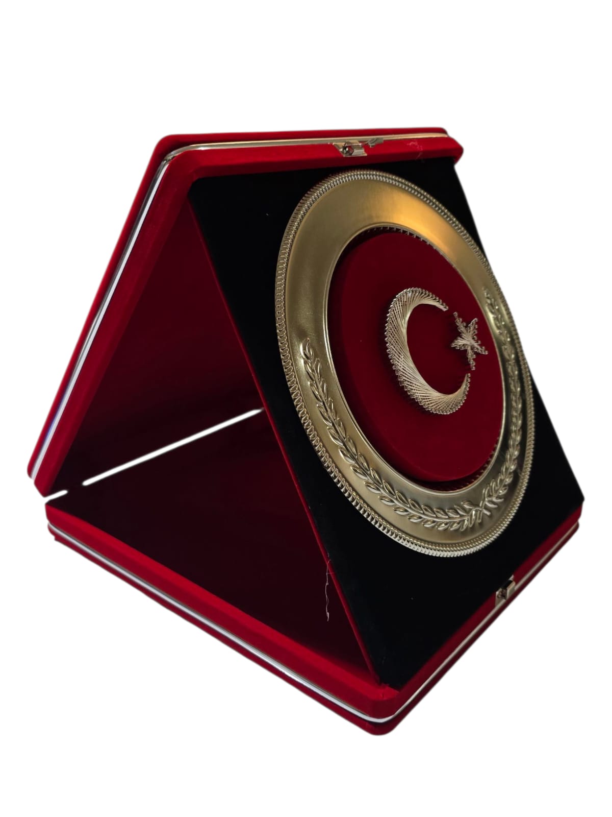 Filografi Türk Bayrağı Yuvarlak Tabaklı Plaket Model Lüks Kadife Kutulu
